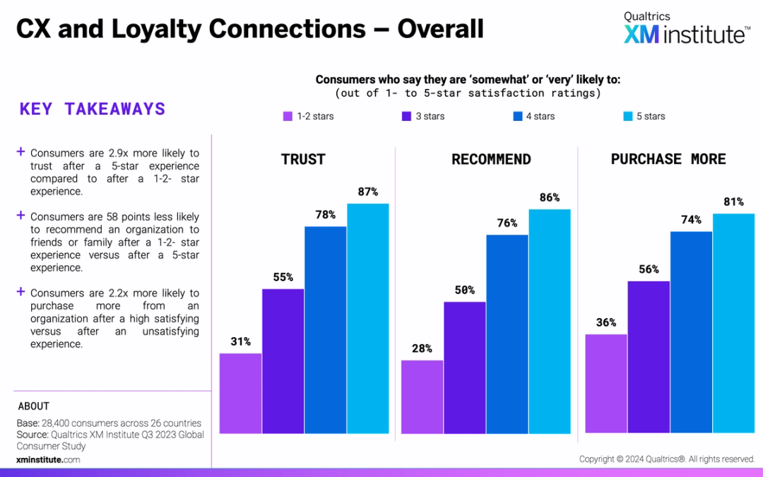 Để đánh giá hiệu quả đầu tư của CX, Qualtrics đã thực hiện cuộc nghiên cứu người tiêu dùng toàn cầu năm 2023, trong đó 28.400 người tiêu dùng đã đánh giá mức độ hài lòng trên 20 ngành với thang điểm từ 1-5 và cho biết khả năng tin tưởng, tin tưởng, giới thiệu và mua hàng nhiều hơn sau trải nghiệm đó. Theo kết quả khảo sát, Qualtrics đã phân tích và đưa ra những kết luận như sau: