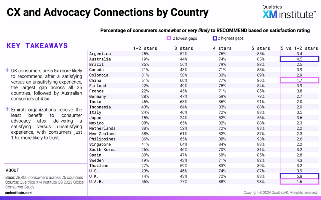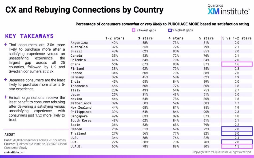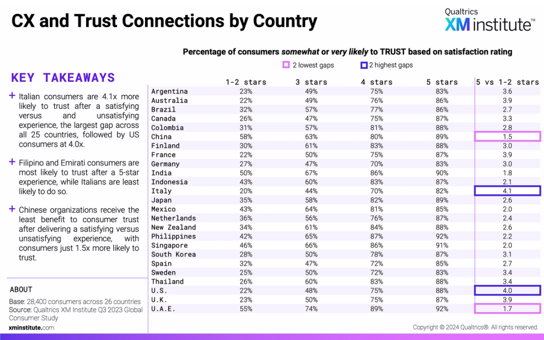 So sánh giữa các quốc gia Ý, Anh và Thái Lan, sau mỗi trải nghiệm hài lòng, người tiêu dùng Ý có khả năng tin tưởng cao hơn 4,1 lần, còn người mua hàng tại Anh sẽ có khả năng giới thiệu cao hơn 5,8 lần, người tiêu dùng Thái có khả năng mua nhiều hơn 2,8 lần.