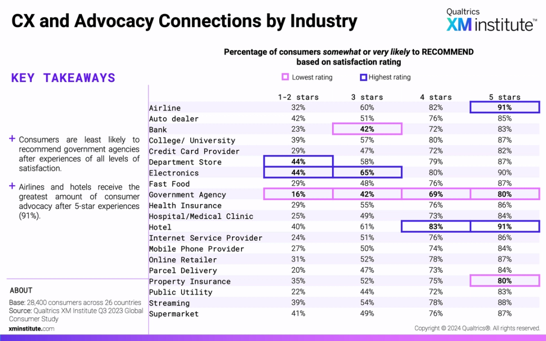 Để đánh giá hiệu quả đầu tư của CX, Qualtrics đã thực hiện cuộc nghiên cứu người tiêu dùng toàn cầu năm 2023, trong đó 28.400 người tiêu dùng đã đánh giá mức độ hài lòng trên 20 ngành với thang điểm từ 1-5 và cho biết khả năng tin tưởng, tin tưởng, giới thiệu và mua hàng nhiều hơn sau trải nghiệm đó. Theo kết quả khảo sát, Qualtrics đã phân tích và đưa ra những kết luận như sau: